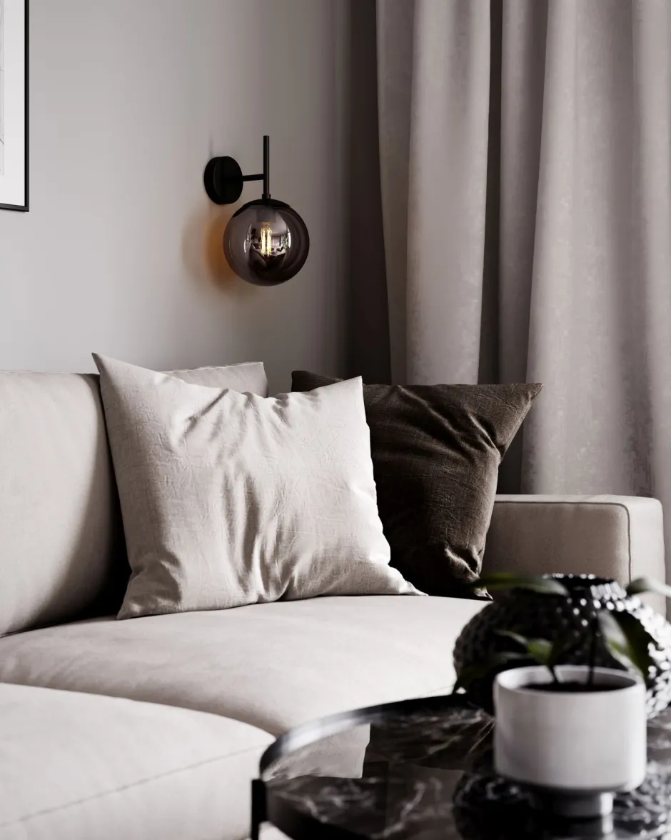 Der Kugelschirm aus Rauchglas verleiht der Wandleuchte einen dekorativen Look, der ideal in Wohnzimmer und Schlafzimmer passt