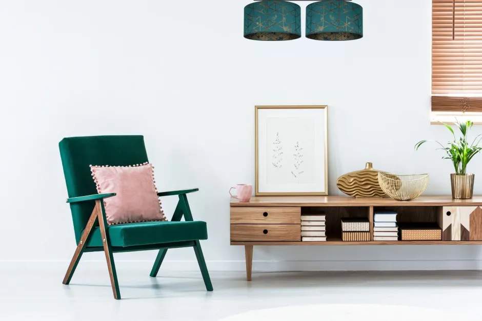 Die grünen Stoffschirme mit dekorativem Muster streuen das Licht diffus und blendarm in den Raum