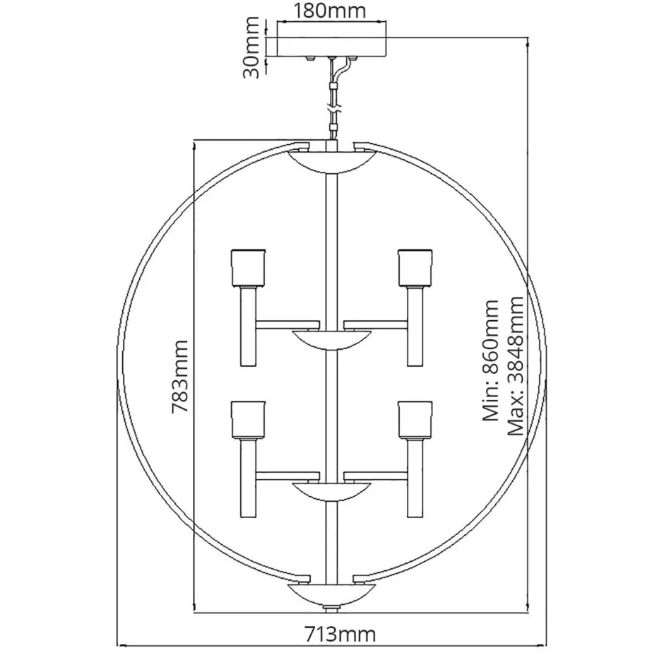 | Maße: | Breite: 713 mm | Hängetiefe: 860-3848 mm | Länge: 713 mm | Durchmesser: 713 mm | Höhe Schirm: 783 mm | Kabellänge: 3048 mm |