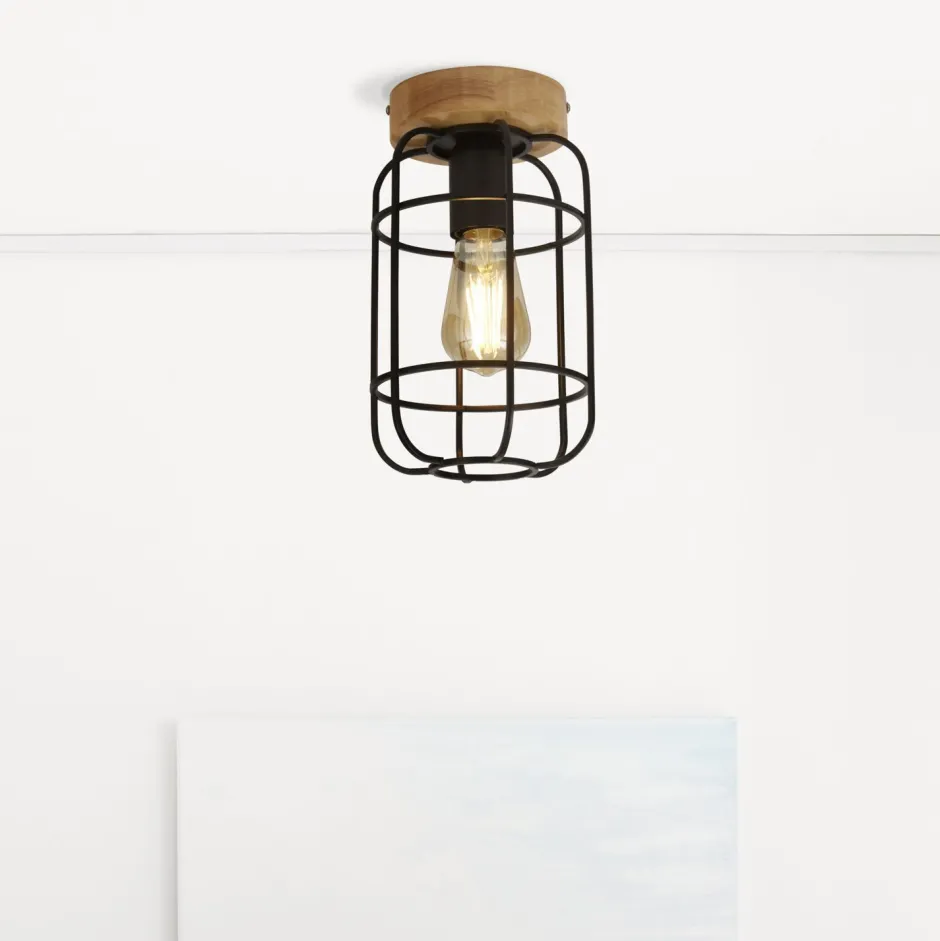 Industrie Deckenspot aus Gummiholz und Stahl in Natur und Schwarz
