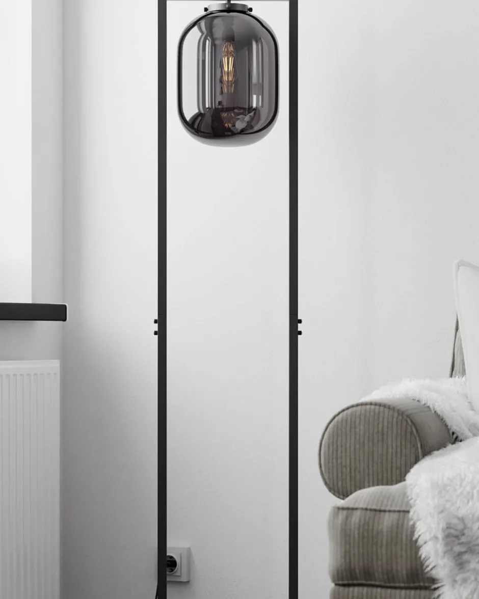 Der Schirm aus Rauchglas unterstreicht das außergewöhnliche Design und erlaubt eine großzügige Beleuchtung – ideal neben dem Sofa oder als Hintergrundbeleuchtung