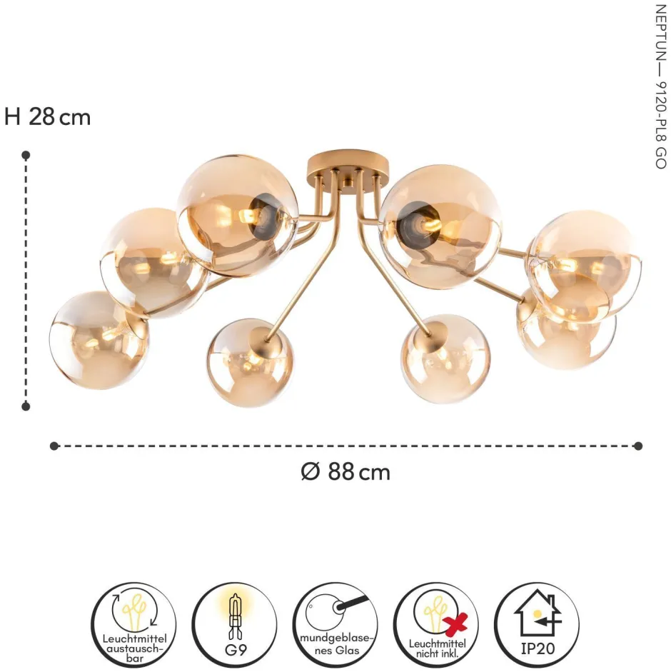 Freie Leuchtmittelwahl: Helligkeit und Lichtfarbe können mit der Wahl passender G9 Leuchtmittel individuell bestimmt werden | nicht im Lieferumfang enthalten Entdecke die perfekte Kombination aus modernem Design und funktionaler Eleganz mit unserer stilvollen Deckenlampe. Diese Deckenleuchte ist nicht nur ein Blickfang in jedem Raum, sondern sorgt auch für eine angenehme Lichtstimmung, die zum Verweilen einlädt. Ob im Wohnzimmer, Flur, Bad oder Arbeitszimmer – die vielseitige Deckenlampe passt sich harmonisch deinem Wohnstil an. Die Deckenlampe besticht durch ihre champagnerfarbenen Gläser, die ein warmes, weiches und blendarmes Licht erzeugen. So schaffst du eine gemütliche Atmosphäre, die sowohl für entspannte Abende als auch für produktive Arbeitsstunden ideal ist. Mit einem Durchmesser von 280 mm und einer Höhe von 880 mm fügt sich die Leuchte perfekt in deine Räume ein, während die festen Arme vom Baldachin eine stabile und ansprechende Aufhängung bieten. Dank der IP20 Schutzklasse ist die Deckenlampe für den Innenbereich geeignet und überzeugt durch ihre hochwertige Verarbeitung aus Metall und Glas. Du hast die Freiheit, das passende G9 Leuchtmittel bis 28W selbst auszuwählen, um die Lichtintensität nach deinen Wünschen zu gestalten. Diese Flexibilität macht die Lampe zu einer idealen Wahl für designbewusste Käufer, die Wert auf Qualität und Funktionalität legen. Fazit: Mit dieser Deckenlampe entscheidest du dich für ein modernes Lichtkonzept, das sowohl stilvoll als auch funktional ist. Lass dich von der Kombination aus elegantem Design und warmem Licht begeistern und verwandle dein Zuhause in eine Wohlfühloase.