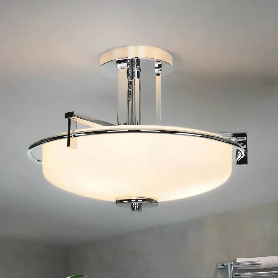 Die klassischen Farben Weiß und Chrom machen die Deckenleuchte zu einem vielseitigen Lichtspender