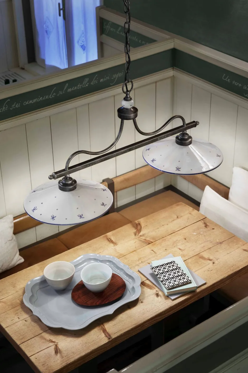 Stilvolle Pendelleuchte mit verzierten Keramik Lampenschirmen im rustikalen Landhaus Stil