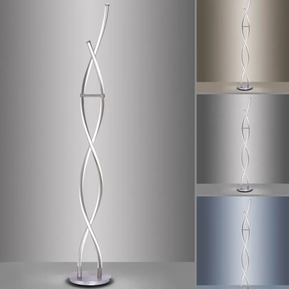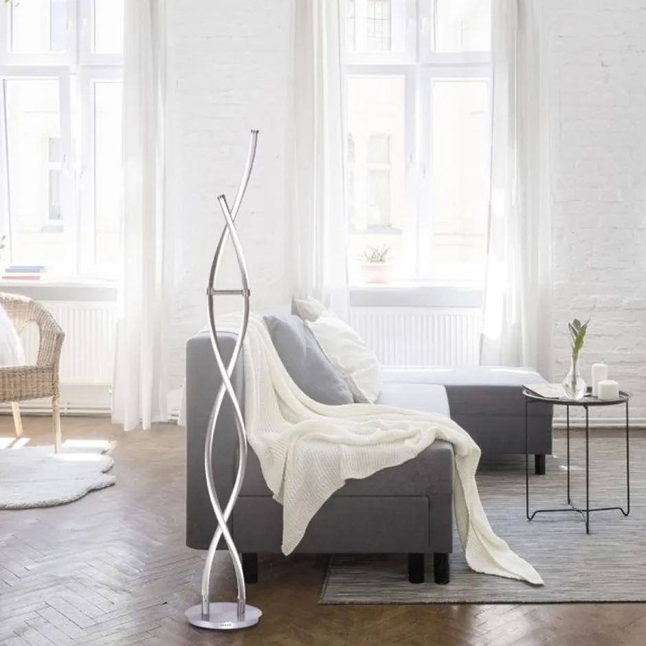 Das längliche Wellen-Design der Stehleuchte wird zum Hingucker als Ambientelicht im Wohnzimmer neben der Couch
