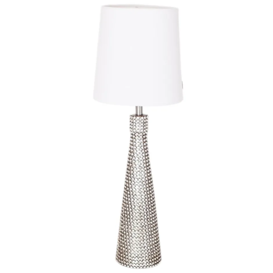 Große Tischlampe mit Stoffschirm und kunstvollem Fuß