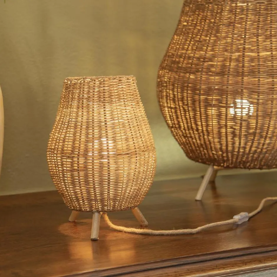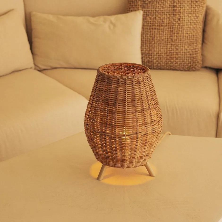Der Korpus aus Rattan macht die Tischlampe zu einem dekorativen Blickfang in Wohnzimmer und Schlafzimmer