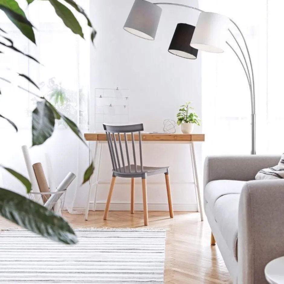 Die Stoff Schirme in Weiß, Schwarz und Grau sorgen für diffuses, weiches Licht und ein gemütliches Ambiente im Wohnzimmer